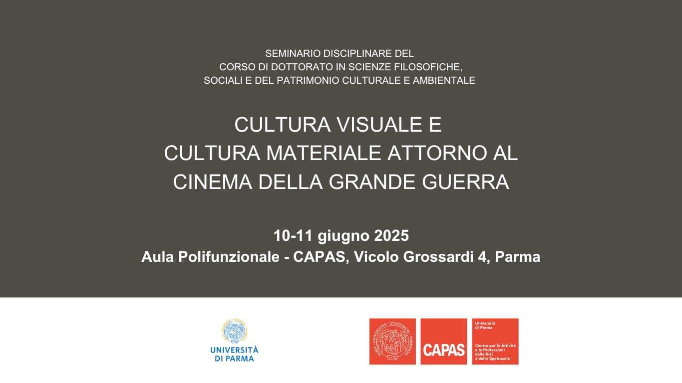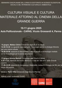 Il Centro per le Attività e le Professioni delle Arti e dello Spettacolo – CAPAS dell’Università di Parma ospita nelle giornate del 10 e dell’11 giugno un seminario disciplinare del Corso di Dottorato in Scienze filosofiche, sociali e del patrimonio culturale e ambientale dal titolo Cultura visuale e cultura materiale attorno al cinema della Grande Guerra, aperto a tutte le dottorande e ai dottorandi della Scuola dottorale in Scienze umanistiche e sociali dell’Università di Parma e a tutti gli interessati.