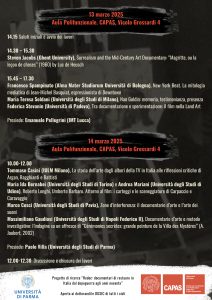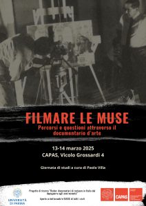 Le giornate di studi, aperte a tutte le dottorande e ai dottorandi dell’Università di Parma, si terranno presso l’Aula Polifunzionale del CAPAS, in Vicolo Grossardi n. 4, e intendono indagare da molteplici prospettive il film sull’arte, riunendo un gruppo di studiosi e studiose che da tempo si occupano di questo oggetto di ricerca.