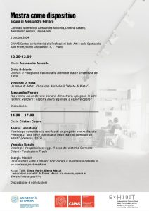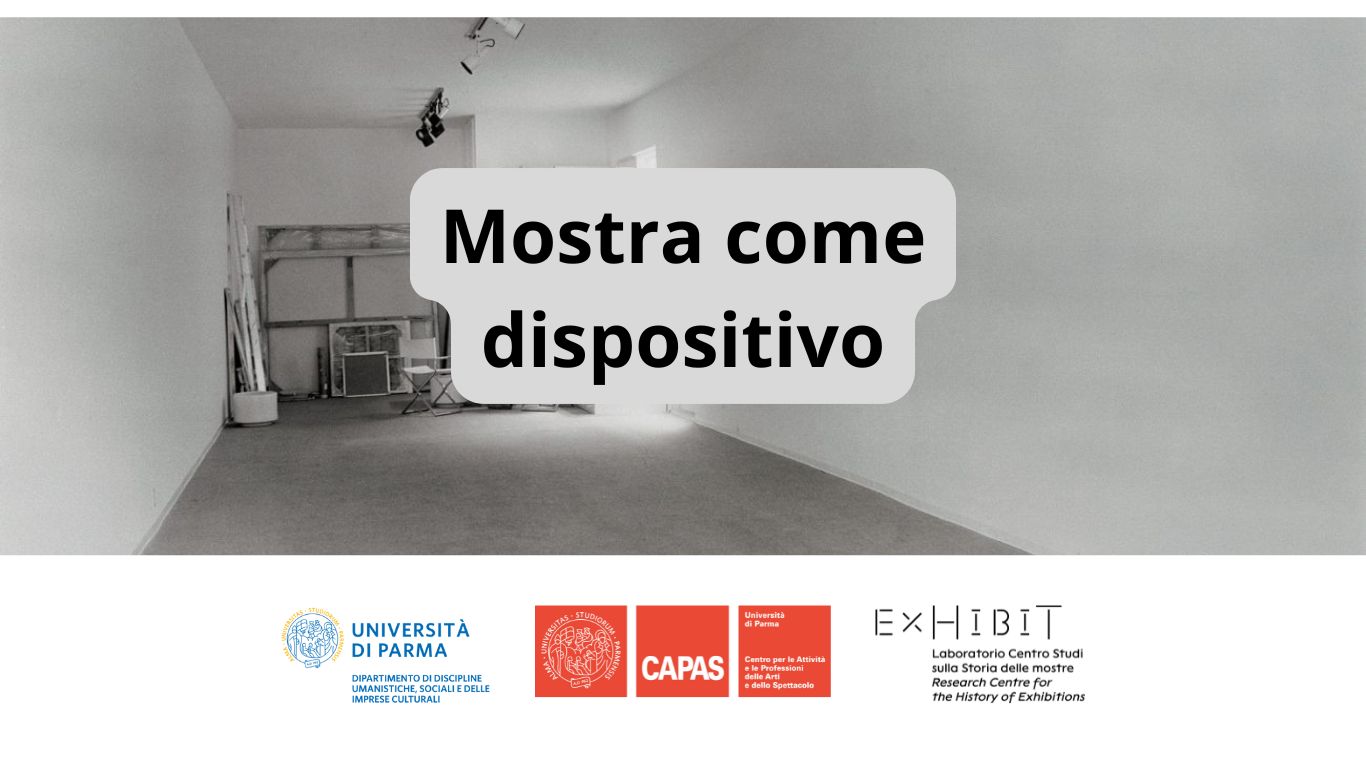 Il seminario di studi Mostra come dispositivo, a cura di Alessandro Ferraro, promosso dal Centro per le Attività e le Professioni delle Arti e dello Spettacolo- CAPAS in collaborazione con Exhibit – Laboratorio Centro Studi sulla Storia delle mostre dell’Università di Parma, intende essere un momento di riflessione sulle pratiche espositive contemporanee, le loro specificità storiche, allestitive e curatoriali.