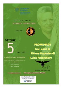 Il Centro per le Attività e le Professioni delle Arti e dello Spettacolo – CAPAS, alle ore 18:00 del 5 ottobre, ospiterà il recital di poesia e musica “Promenade tra i versi di Pittura rupestre di Luisa Futoransky”, a cura di Giorgia Delvecchio con musiche originali di Antilabé, in collaborazione con la rassegna LetterariaMente organizzata da Olga Perotti e María Valero Gisbert e promossa dal DUSIC – Dipartimento di Discipline Umanistiche, Sociali e delle Imprese Culturali dell’Università di Parma.