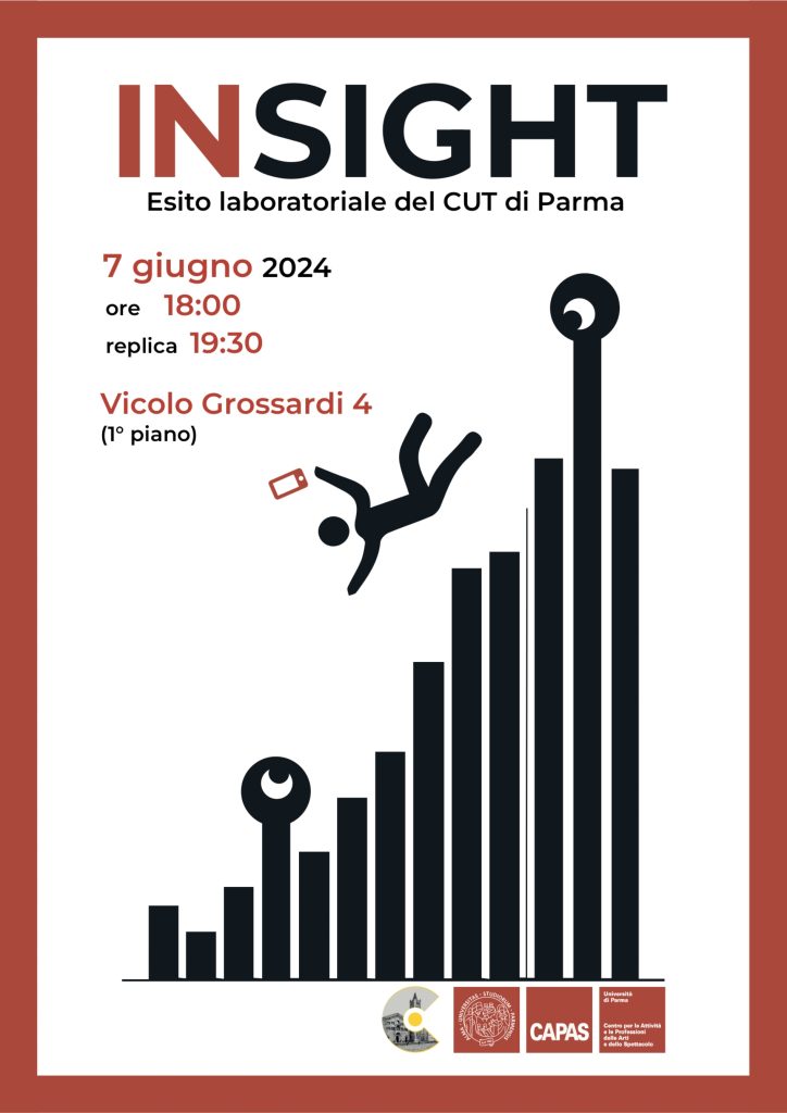 Nella Sala Prove del Centro per le Attività e le Professioni delle Arti e dello Spettacolo – CAPAS, in Vicolo Grossardi n. 4 al 1° piano, venerdì 7 giugno avrà luogo l’esito finale del laboratorio didattico dell’anno accademico 2023-24 del CUT – Centro Universitario Teatrale dell’Università di Parma. La performance sarà replicata due volte: il primo spettacolo alle 18.00 e il secondo alle 19.30.