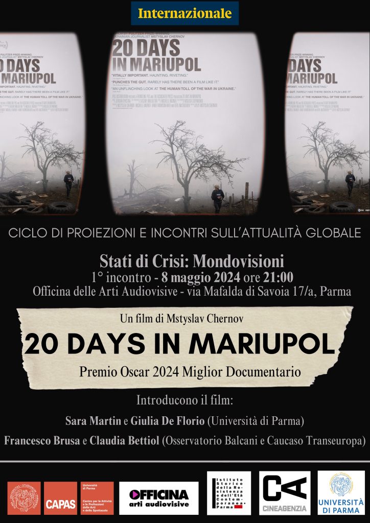 L’8 maggio alle 21 all’Officina delle Arti Audiovisive (Via Mafalda di Savoia 17/a, Parma) ci sarà la proiezione di 20 days in Mariupol di Mstyslav Chernov, incentrato sul significato e sulla necessità della testimonianza giornalistica nel contesto della recente guerra in Ucraina.