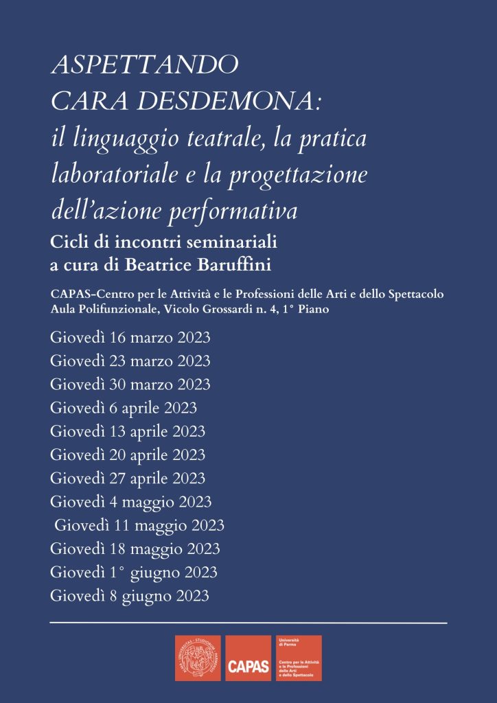 Dal 16 marzo 2023 prende il via un ciclo d’incontri seminariali organizzati dal CAPAS dal titolo Aspettando Cara Desdemona: il linguaggio teatrale, la pratica laboratoriale e la progettazione dell’azione performativa a cura di Beatrice Baruffini, nell’ambito delle attività settimanali del Centro Universitario Teatrale-CUT dell’Università di Parma, aperte a tutti gli studenti e le studentesse dell’Ateneo.