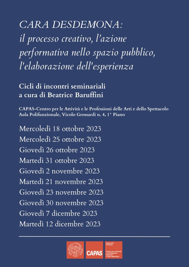 Dal 18 ottobre 2023 prende il via un ciclo d’incontri seminariali organizzati dal CAPAS dal titolo Cara Desdemona: il processo creativo, l’azione performativa nello spazio pubblico, l’elaborazione dell’esperienza a cura di Beatrice Baruffini, nell’ambito delle attività settimanali del Centro Universitario Teatrale-CUT dell’Università di Parma, aperte a tutti gli studenti e le studentesse dell’Ateneo.