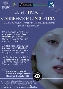 In occasione del Giorno della Memoria l’Università di Parma propone una rassegna dal titolo La vittima, il carnefice e l’industria. Hollywood e la Shoah tra rappresentazione, divismo e diaspora per onorare questa ricorrenza, istituita il 27 gennaio per commemorare le vittime della Shoah, attraverso percorsi contemporanei, linguaggi ed elaborazioni memoriali a confronto, mediante una serie di proiezione cinematografiche anticipate da una breve intervento dei docenti e dei dottorandi dell’area Cinema dell’Ateneo.