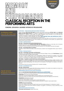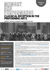 Dopo l’esordio del progetto internazionale in due tappe tra Parma (20-24 ottobre 2022) e Londra (20-24 febbraio 2023) sulla ricezione classica nelle arti performative, l’Università di Parma organizza dal 22 al 28 ottobre la Fall School Internazionale 2023 Memory and Performance: Classical Reception in the Perfoming Arts, all’interno del programma BIP-Erasmus, in partnership con 7 università straniere (Université de Tours, Univerzita Palackého v Olomouci, University of Groningen, Université Paris Sorbonne Nouvelle, Université Paris Nanterre, Université Paris 13 e University College London) e in collaborazione con la Fondazione Teatro Regio, il CAPAS-Centro per le Attività e le Professioni delle Arti e dello Spettacolo, l’Archivio della Casa della Musica-Comune di Parma, il Liceo classico Romagnosi e il Liceo artistico Toschi di Parma, il Teatro delle Albe/Ravenna Teatro, con il patrocinio del Centro per le Arti Performative-MAP.