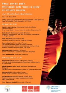 Il Centro per le Attività e le Professioni delle Arti e dello Spettacolo- CAPAS dell’Università di Parma ospita e propone la Giornata di Studi Danza, cinema, moda. Intersezioni sulla “messa in scena” del divenire corporeo, aperto agli studenti dei Corsi di Laurea triennale, magistrale e dottorandi del Dipartimento di Discipline Umanistiche, Sociali e delle Imprese Culturali dell’Ateneo di Parma. Il completo espletamento della giornata di studi porterà ad acquisire 1 CFU per attività libere di partecipazione in ambito artistico e culturale.