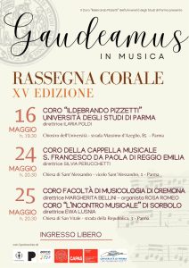 - 25 maggio – ore 20.30: Concerto del Coro della Facoltà di Musicologia di Cremona, diretto da Margherita Bellini, e del Coro “L’incontro musicale” di Sorbolo, diretto da Ewa Lusnia, nella Chiesa di San Vitale (Strada della Repubblica, 3 – Parma).