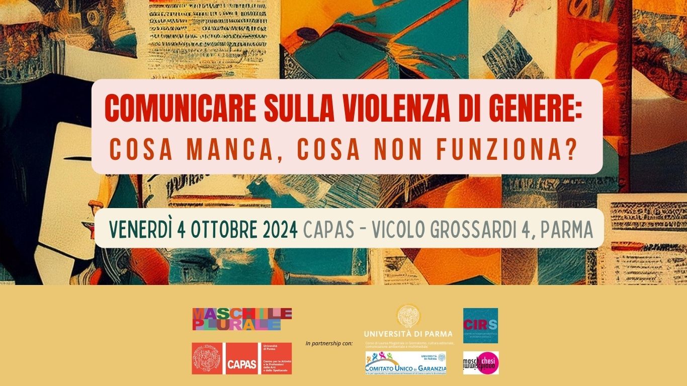 L’evento è organizzato dal corso di laurea magistrale in Giornalismo, cultura editoriale, comunicazione ambientale e multimediale del Dipartimento di Studi umanistici, sociali e delle imprese culturali dell’Università di Parma (DUSIC), in collaborazione con il CUG (Comitato Unico di Garanzia per le pari opportunità, la valorizzazione del benessere di chi lavora e contro le discriminazioni), il CAPAS, il CIRS (Centro Interdipartimentale di Ricerca Sociale “Diritti, società e civiltà”), le associazioni Maschile Plurale e Maschi che si Immischiano.