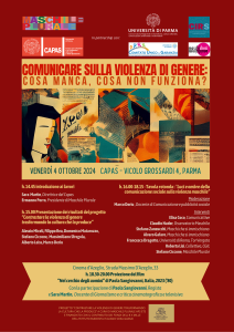 La violenza di genere nell’informazione. Linguaggi, immagini e forme di comunicazione è il titolo del convegno che si terrà giovedì 3 e venerdì 4 ottobre all’Università di Parma nell’Aula K4 di via Kennedy. A seguire, il pomeriggio del 4 ottobre, spazio all’incontro Comunicare sulla violenza di genere: cosa manca? Cosa non funziona? in programma al CAPAS, Centro per le Attività e le Professioni delle Arti e dello Spettacolo dell’Ateneo, in vicolo Grossardi. La “due-giorni” si chiuderà con la proiezione del film “Nel cerchio degli uomini” di Paola Sangiovanni al Cinema D’Azeglio.