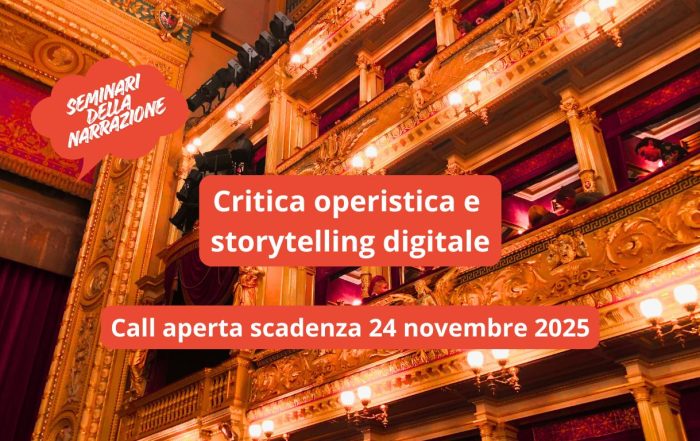 Critica operistica e storytelling digitale CAPAS - Seminari della narrazione Call aperta scadenza 24 novembre 2025 20 posizioni massimo Candidature aperte fino al 24 novembre 2025 All’interno della progettualità Seminari della narrazione [...]