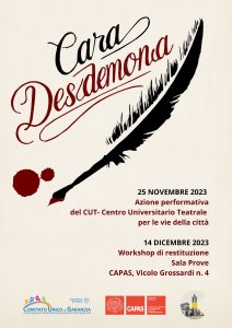 Il 14 dicembre 2023 negli spazi del CAPAS si svolgerà poi un Workshop di restituzione finale aperto a tutta la cittadinanza, studentesca e non. Al cento del workshop l’elaborazione dell’esperienza che il progetto Cara Desdemona ha saputo generare; verranno condivise le lettere e i feedback ricevuti, le risonanze generate dall’azione performativa del 25 novembre, e vi sarà occasione per condividere l’esperienza vissuta e per esplorare le consapevolezze acquisite.