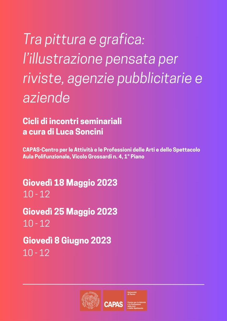 Dal 18 maggio 2023 prende il via un ciclo d’incontri seminariali organizzati dal CAPAS dal titolo Tra pittura e grafica: l’illustrazione pensata per riviste, agenzie pubblicitarie e aziende a cura di Luca Soncini, aperto a tutti gli studenti e le studentesse dell’Università di Parma.